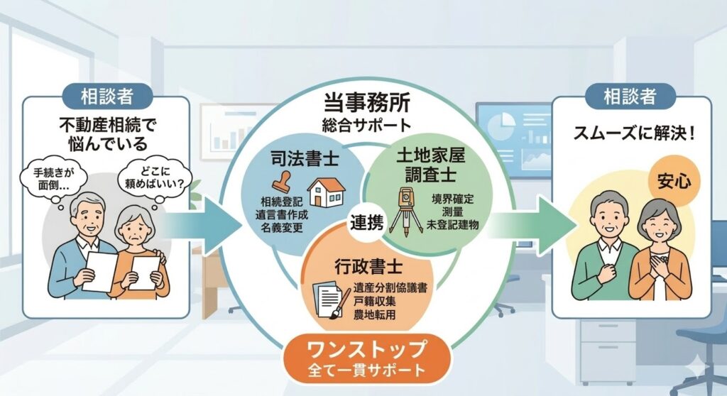 上記図の通り、「当事務所」に一度ご相談いただくだけで、登記・測量・書類作成がスムーズに連携し、解決へと向かいます。